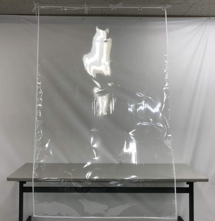 一挙に全国の多くの業種が ビニールカーテンを設置した事によって 農業用ビニールも 工業用ビニールも 全くの品切れ状態になりました。 そこで 株式会社吉澤は、ガラス面などのUVカットなどに使われている 透明フィルムを 縁取り補強縫製や ハトメ補強縫製を施し 紐で縛り付けるビニールカーテンに代わる、透明フィルムカーテンとして開発いたしました。