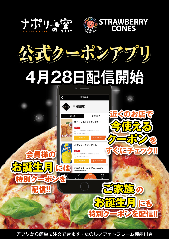 株式会社ストロベリーコーンズ(本社:仙台市青葉区、代表取締役社長:宮下雅光)の運営する宅配ピザチェーン【ナポリの窯】【ストロベリーコーンズ】は直営店、FC店全店でご利用いただける「ナポリの窯・ストロベリーコーンズ 公式クーポンアプリ」を2020年4月28日より配信致します。