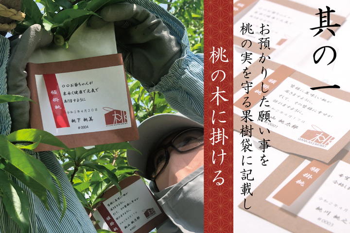 ①お預かりした願い事を「果樹袋」 に記載して桃農家が桃の木に掛ける
