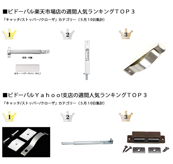 建築金物の株式会社ビドーが楽天市場店とYahoo!支店の各通販サイトでの週間人気ランキングTOP3を発表しました。