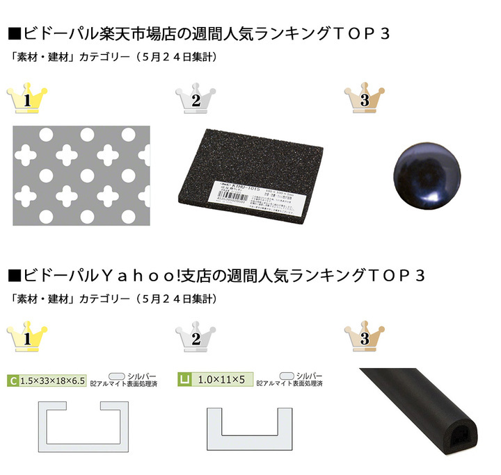 建築金物の株式会社ビドーが楽天市場店とYahoo!支店の各通販サイトでの週間人気ランキングTOP3を発表しました。