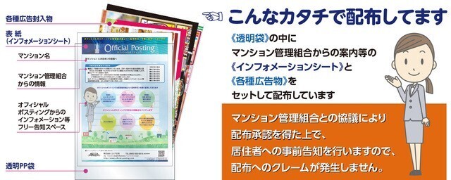 「オフィシャルポスティング」は、各マンションの管理組合から、配布の許可を得てから配布する、マンション公認のオフィシャルなポスティングサービスとなっております。 オフィシャルポスティングを導入いただいたマンション管理組合には、広告費の一部をシェアし、修繕積立金等の補完にお役立ていただけます。 ■マンション公認ポスティングサービス「オフィシャルポスティング」 http://official-posting.com/