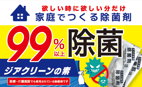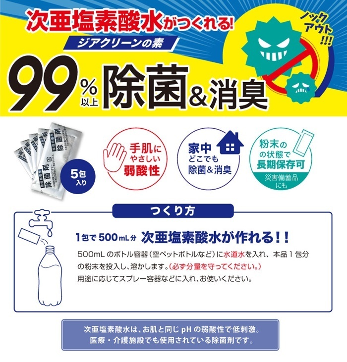 水道水に溶かすだけで次亜塩素酸水が作れます。99%以上除菌&消臭。