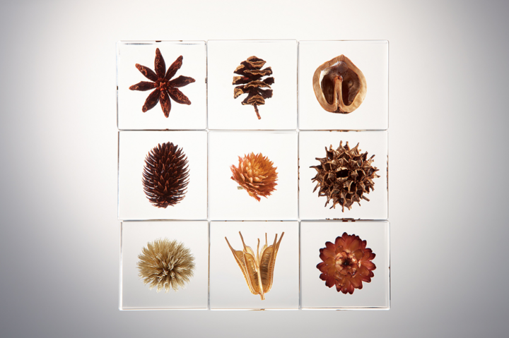 生命誕生から38億年。植物はその命を未来へつなぐため、花を、果実を、そして種子をつくりあげてきました。ただ生きぬくために削ぎ落されたその規則的でストイックなフォルムは、自然が生み出した究極の機能美と言えるでしょう。その美しい瞬間をとらえて、4cm角の透明のアクリルキューブに封入しました。