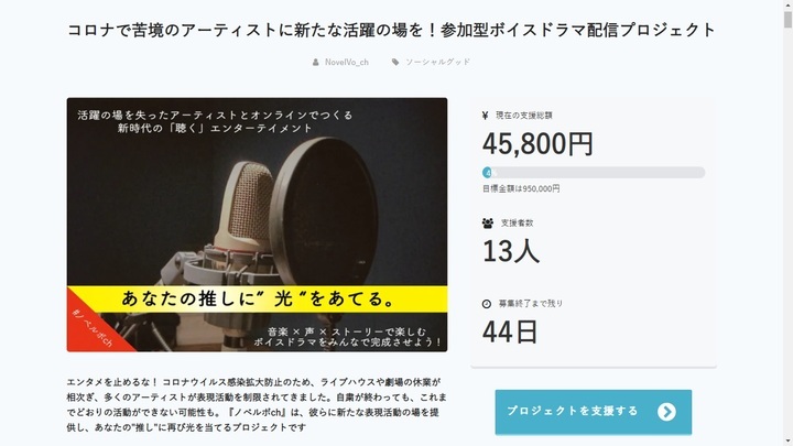 『コロナで苦境のアーティストに新たな活躍の場を!参加型ボイスドラマ配信プロジェクト』( https://camp-fire.jp/mypage/projects/280693)