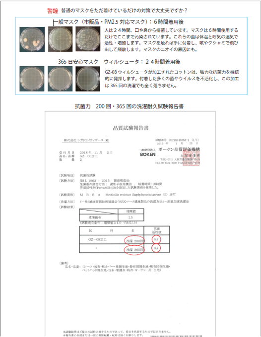 「365日安心マスク ウィルシュータ」は開発されました。GZ-08加工のコットン100%のガーゼマスクです。 *コットン100%ガーゼに、抗ウイルスGZ-08を加工したマスクです。 1年365日連続して洗濯しても効果は落ちず、1日5円と抜群の低コスト! コットンですから何度でも洗うことができ、365日連続しての使用が可能です。価格は3,650円(税別)。1年間365日洗濯しても効力は全く失われず、長時間着用していてもウイルスに抵抗し、安心で嫌な臭いも感じません。1日あたりのコストは10円、2枚セットなので2人で使えば5円です。使い捨てない! 地球環境にも優しく、ウイルスから我々を護ってくれます。