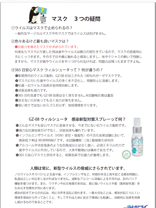 地球と共に歩み、人類の未来を築く 株式会社 シガドライ・ウィザーズは「365日安心マスク ウィルシュータ」と「全身防護GZ-08スプレー」を好評発売中です。