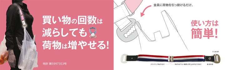 「荷物増えても安心チャーム『リリチャ』」は、肩かけ用のベルトの両端に2つのフック状金具を取り付けたシンブルな構造です。買い物袋を両側の金具に引っ掛けてベルトを背負うなど、日常重いものをもつ場面で威力を発揮します。