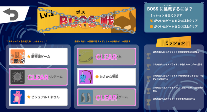 ビジュアルプログラミング言語「Scratch」を使い、プログラミングにチャレンジ。90分の中でミッションとゲームをコンプリートしていく。実力がつくとボスに挑戦できる権利が与えられる世界はまさにゲームそのもの。自分だけのアレンジも加え、自分で考えて作る楽しさを体験できます。プログラミングははじめてというお子さまに最適です。