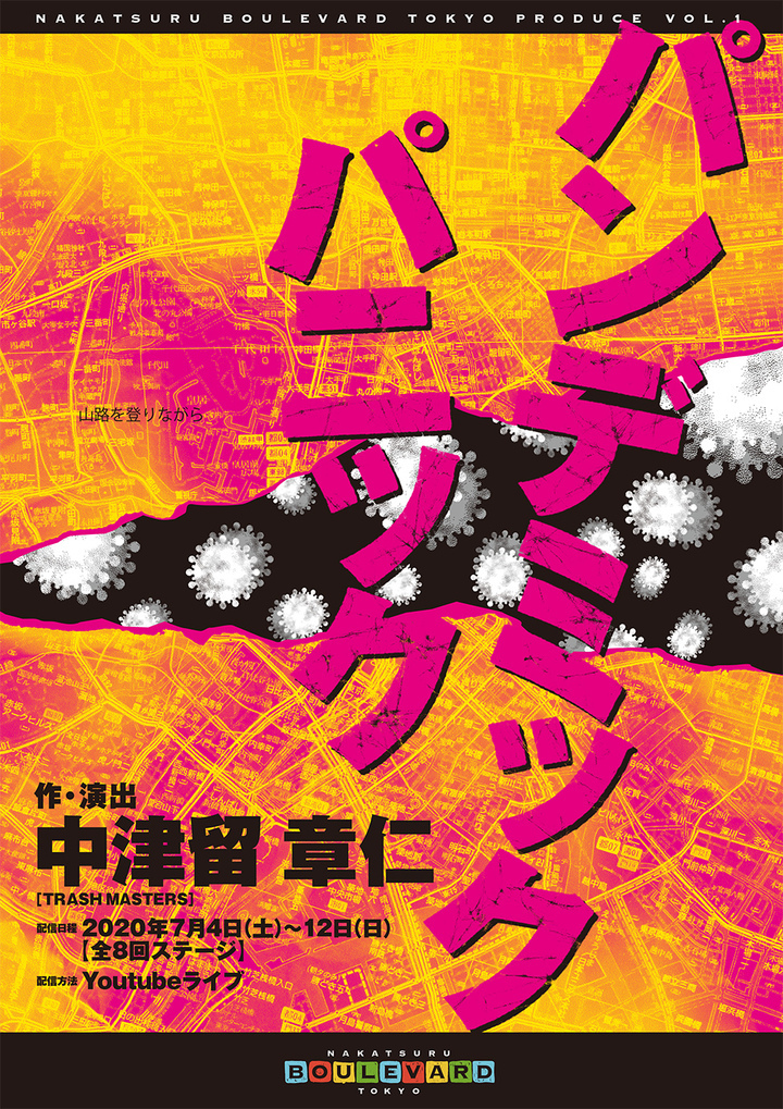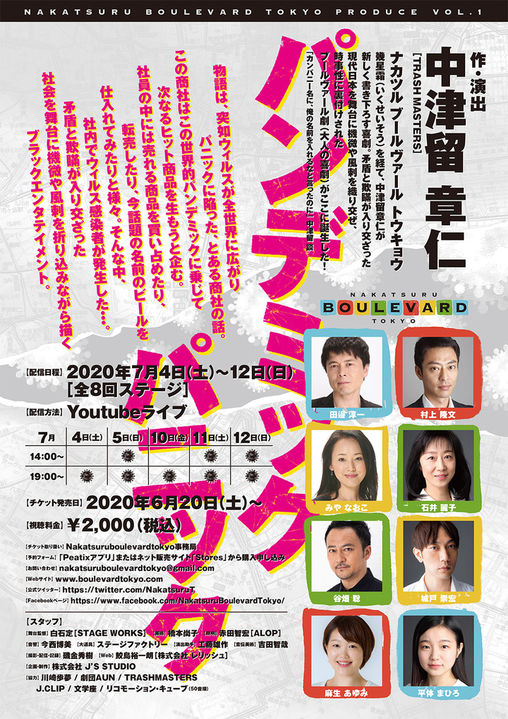 俳優の田邉淳一と村上隆文の2人が劇作家の中津留 章仁とともに発足した演劇ユニット「ナカツル ブールヴァール トウキョウ(Nakatsuru Boulevard Tokyo)」は、7月4日(土)・5日(日)・10日(金)・11日(土)・12日(日)の5日間、劇場のステージと客席をセットに無観客で上演する「パンデミック・パニック」(中津留 章仁作・演出)を午後2時および午後7時の計8回にわたってYouTubeでライブ配信します。矛盾と欺瞞が入り交ざった現代社会を舞台に、機微や風刺を折り込みながら描くブラックエンターテインメント作品を6台以上のカメラで撮影。映画の手法を駆使して迫力と臨場感を伝える新しい試みです。