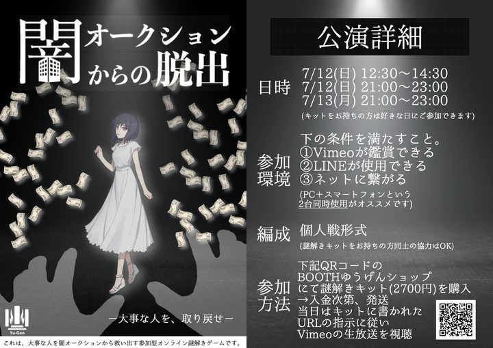 各方面から絶賛を受けた「イベント制作団体ゆうげん」のオンライン謎解き公演第一弾「闇オークションからの脱出」を7/12〜13に再演。すでにパッケージ版については予定販売数を完売し、現在ダウンロード版として、好評発売中!