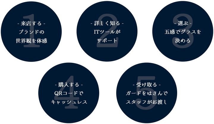 ジュエリー・グラスの発売から約5年が経過し、最も多いといえる「全商品、実物を見て選びたい」というお客様の声に答えるべく、飲み物の為ではなく、グラスの為の試飲をはじめ、五感を使ってグラスを選ぶ ことができる体感型コンテンツを企画。新型コロナウイルス感染症にも配慮し、ITツールでのサポートやキャッシュレスシステムを導入します。