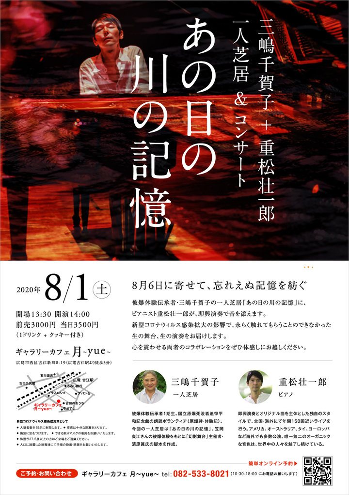 8月1日、被爆体験伝承者・三嶋千賀子の一人芝居「あの日の川の記憶」に、ピアニスト重松壮一郎が、即興演奏で音を添えます。