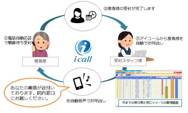 医療機関向け診療受付、呼び出しシステムのiCall、クリニックの感染拡大防止対策支援として、電話(音声ガイダンス)予約、呼出しに対応した最上位プランを半額で提供