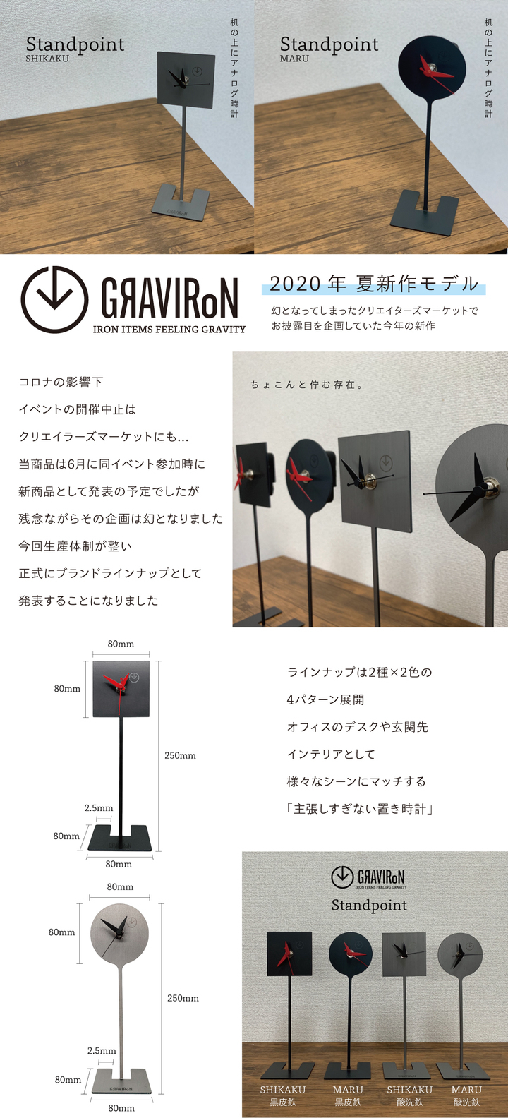 6月のイベントで初お披露目を企画していた今商品。コロナ対策のためイベントは中止にお披露目の機会を逃した商品ですが、今回生産体制が整ったことを受け、正式にブランドラインナップとして販売スタート! その名もGRAVIRoN(グラビロン)Standpoint 。「主張しすぎないインテリア」をコンセプトに立場を弁えた、シンプルでお洒落なインテリア時計を目指したアイテムです。
