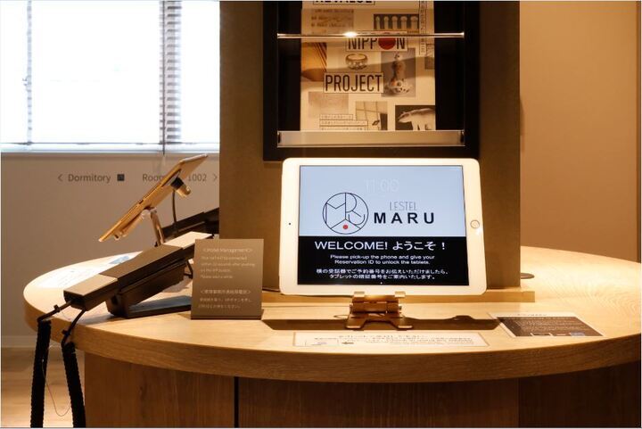 感染症拡大予防にも配慮し、館内にはフロントスタッフは常駐せず、チェックイン用タブレット、スマートロックを設備し、お客様によるセルフチェックインシステムを導入しています。