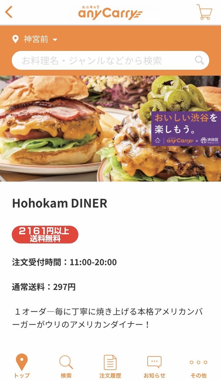 株式会社エニキャリ(本社:東京都千代田区、以下当社)が運営するクイックデリバリーサイト「anyCarry(エニキャリ)」に、原宿のハンバーガー名店「Hohokam DINER」がオープンしたことを報告します。 当社は、消費者が実店舗に足を運ぶことなくオフィスや自宅ですぐに味わえるように、今後も出店店舗を増やし、また年内中にデリバリーエリアを東京都主要区への拡大を目指します。今後のwithコロナ時代はデリバリーニーズが定着することを見据え、飲食店に留まらずさまざまな商品をオフィスや自宅で注文から30分で手元に届く社会を目指し、多様な業種ならびに店舗に合わせた形態でのデリバリー展開を拡充します。