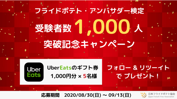 世界最高のフライドポテトを生み出すことを目的として業界の支援を行う日本フライドポテト協会が2020年8月1日より公開した、フライドポテトに関する総合的な知識を測る「フライドポテト・アンバサダー検定」の延べ受験者数が1,000人を突破致しました。これを記念し、Uber Eatsギフト券をプレゼントする「フライドポテト・アンバサダー検定 受験者数1,000人突破記念キャンペーン!」を実施致します。