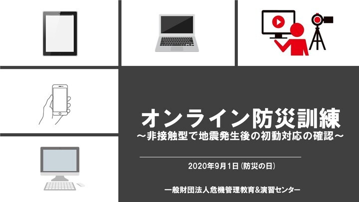 一般財団法人危機管理教育&演習センター (本社:東京都港区、理事長:細坪 信二)は、Web会議ツール「Zoom」を活用して非接触型で地震発生後の初動対応を確認する『オンライン防災訓練』を、2020年9月1日にオンライン環境下で開催いたします。 【オンライン防災訓練の概要】 開催日  :11:30~13:00(受付開始:11:00~) 会場   :参加者のPC、iPad 、スマホ端末を用いて       Zoomホスト(東京都中央区日本橋小網町10-2 日本橋フジビル 地下1階) 参加費  :無料 定員   :50名 お申し込み:03-6365-0281 https://www.cm-eec.net/0901-1/ 参加対象 :企業・団体の防災、危機管理、リスクマネジメント、BC(事業継続)担当 一般財団法人危機管理教育&演習センター 担当:細坪 Tel:03-6365-0281