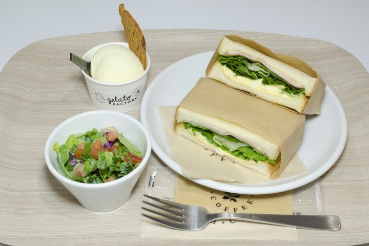 サラダを前菜とし、ボリュームのあるサンドウィッチをメインに、フレッシュなジェラートでしめるという前菜~デザートまでをお楽しみいただけるコースを意識したプレートになっています。ジェラートは、バニラ・シナモンロール・エスプレッソ・マンゴー・ラズベリーの5種類の中からお好きなフレーバーをお選びいただけます。