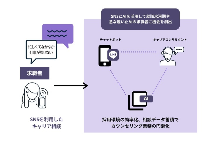 キャリアカウンセリングのLINE相談を軸としたサービスを無料で提供しています。「キャリア相談×IT」で、労働者の貧困問題や国内企業の人材不足など、労働市場における重要課題の解決を目指しています。