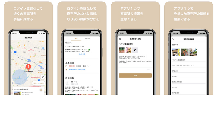 直売所検索アプリのVeggie|ベジーがios版で登場。近くの直売所のどこがオススメかスマホ1つで移動しながら確認。GPSを使い近くの生産者と消費者を繋いで、地産地消を促進。生産者はホームページがなくてもアプリ内でページを簡単に登録・編集し最新情報を手軽に投稿することが可能。