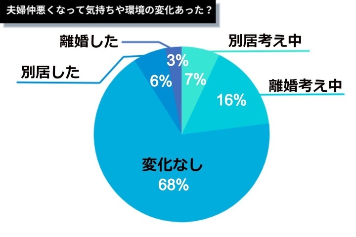 別居・離婚を考え始めた人は全体の約20%、別居・離婚を実行に移した方は全体の10%という結果になりました。