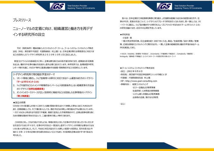 TOC(制約条件)理論を軸にしたコンサルティング・ファーム、ゴール・システム・コンサルティング株式会社(本社:東京都千代田区 代表取締役:村上悟)は、日本企業が新たな環境変化に対応できることを目的とした「リ・デザイン研究所」を2020年10月1日に設立しました。