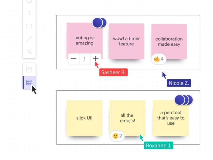 創造 : シームレスにコラボレーションを行い、チーム全体の思考統一の実現。チームはリアルタイムまたは非同期で共同作業ができ、全員の貢献を簡単に把握することができます。Lucidsparkはまた、リーダーがペースを設定して役割を明確にし、参加者が投票や反応をしてアイデアの優先順位を決めることができるようにするなど、構造化されたセッションを促進するための強力な機能も提供しています。