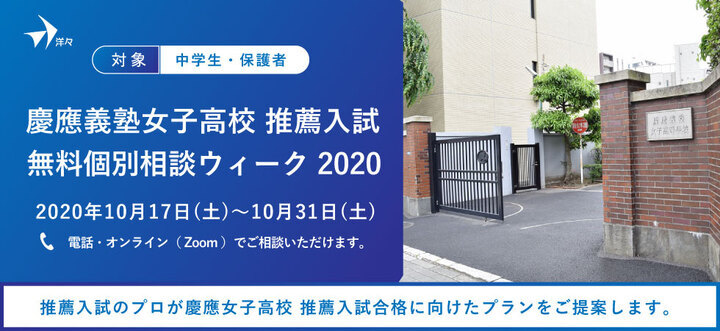 高校推薦入試・小論文対策の個別指導を手がける洋々(本社所在地:東京都渋谷区)は、慶應女子高校の推薦入試を検討されている受験生および保護者の方を対象とした「プロが答える!慶應女子高校 推薦入試 無料個別相談ウィーク」を2020年10月17日(土)~10月31日(土)の期間で開催します。
