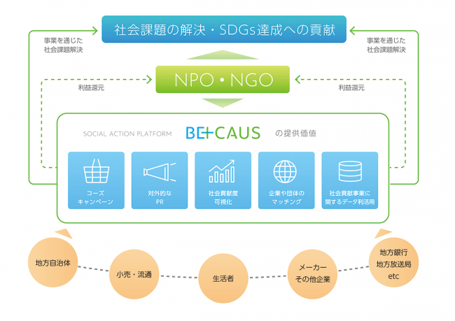 「BE+CAUS」は、小売・メーカーといった企業と、NPO・NGO、生活者が連携し、生活者の日常の買い物を通して、社会課題解決に向けた取り組みを促進させるソーシャルアクションプラットフォームです。生活者に対し、SDGsをはじめとした企業の取り組みを購買の選択肢とすることを可能にするとともに、社会課題解決のビジネスエコシステム構築に向け、活動を推進しています。