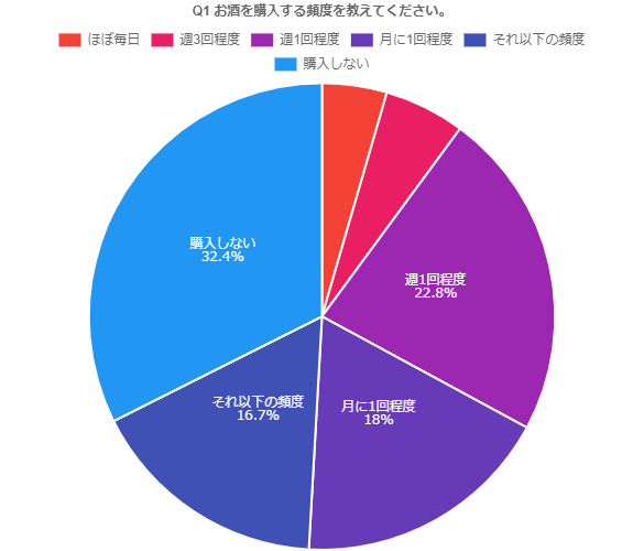 今回調査した項目のうち、まず「お酒」について見てみると、お酒を『購入しない』と回答した人が最も多く、お酒を購入する人の中で最も多かったのが『週1回程度(22.8%)』であり、『月に1回程度(18.0%)』、『それ以下の頻度(16.7%)』と続く結果となりました。