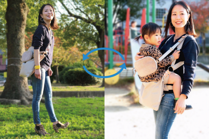 「N/ORN」は、普段はカバンとして…また、お子さまに「抱っこ!」と言われたときにすぐ抱っこできるママ向け抱っこカバンです。