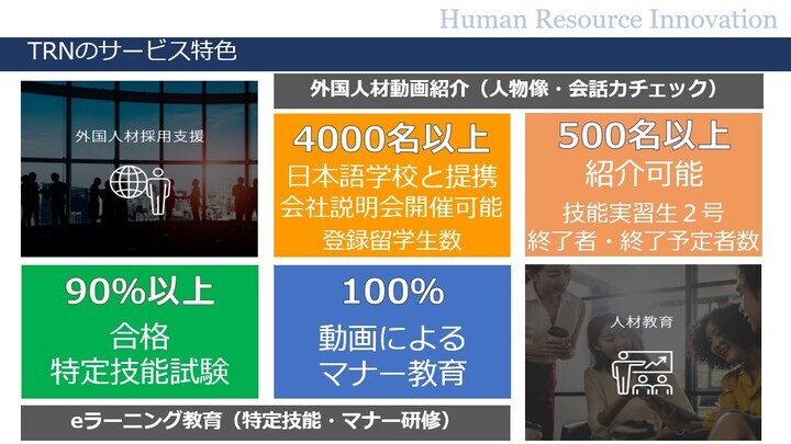 ベトナムに開設した「TRNジョブトレーニングセンター」と、eラーニングシステムなどの教育コンテンツにより、日本企業で即戦力として活躍できる人材を教育し、企業が求める技術や語学を習得した外国人材を紹介します。在日日本語学校での会社説明会や留学生の募集、自己紹介動画による“0次面接”の実施、煩雑なビザ申請および更新に関する書類回収・作成といったトータルサポートにより、企業とのミスマッチ、入社後の離職を防止しています。