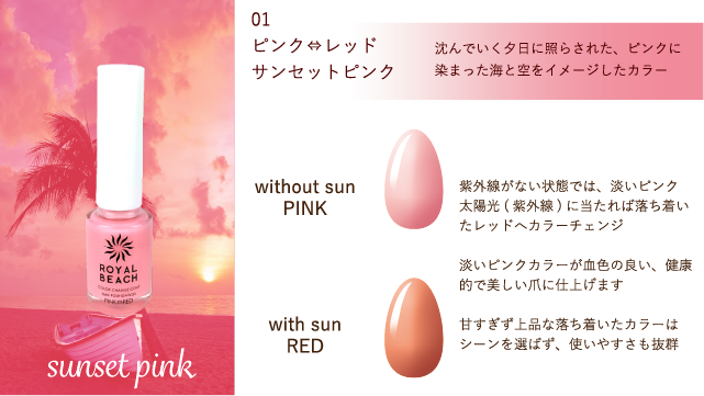 変化前のカラーはライトベージュ・太陽光に当たれば鮮やかなピンクに変化。