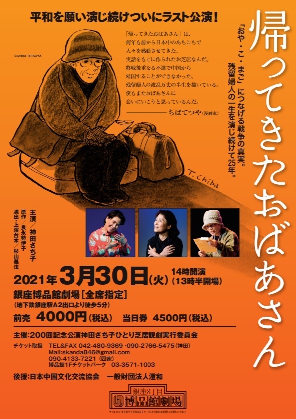 中国残留婦人の半生を描いたひとり芝居『帰ってきたおばあさん』を1996年の初演以来、日本各地で、さらには中国ハルビン、長春、北京から安徽省合肥まで、微妙な日中関係も乗り越えて公演を重ねてきた女優・神田さち子。