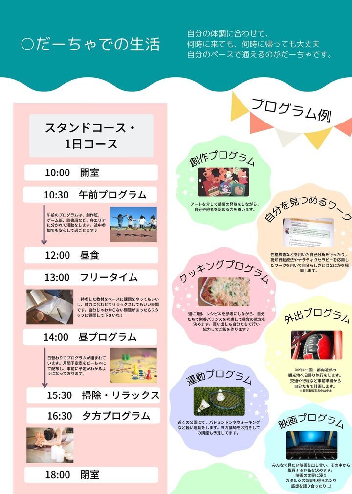今必要な居場所の提供だけでなく、その後の自立や社会に出るための応援もしていきます。認知や感情を上手に扱えるようになること や、コミュニケーションスキルを向上すること を目標にしたプログラムを用意しています。またプログラム以外の時間も、仲間との間で円滑な対人関係を構築するスキルを引き出せるようスタッフがサポートします。