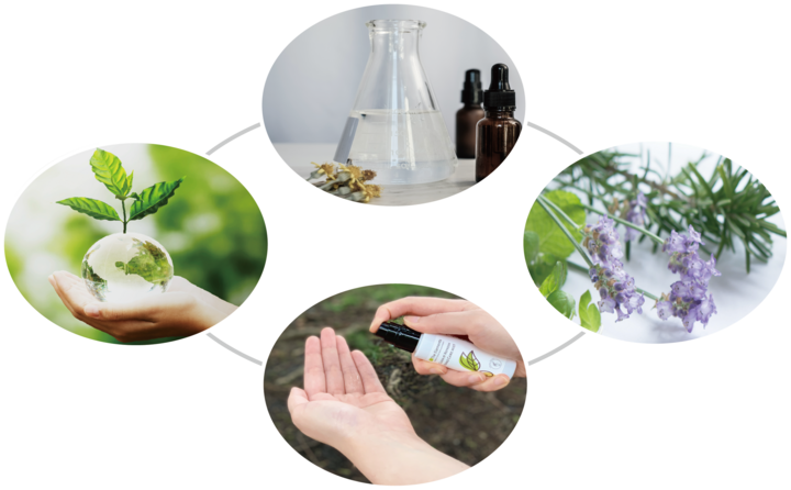 フェアトレードで調達したアルコール*2(フェアトレード認証・オーガニック認証*4のダブル認証 取得原料)をはじめ、オーガニック認証*4取得原料のみ*1を使用 した、天然由来成分100%のエシカルなアルコール*2配合手指用化粧水(化粧品)は『Clean & Refresh Hand Care Mist』が日本初 *7です。