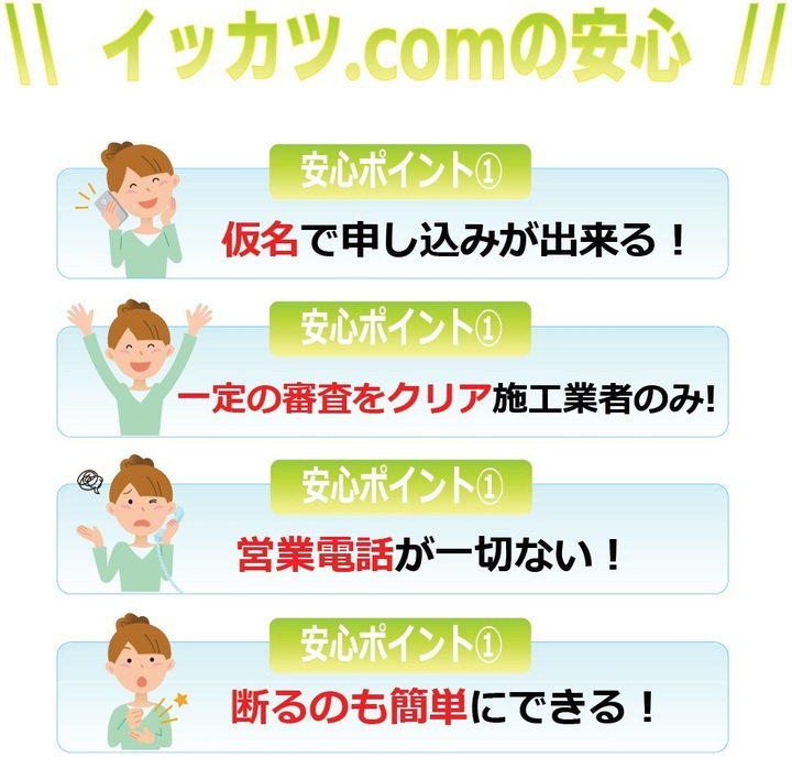 ・イッカツ.comが窓口なので施工業者から営業電話はなく、イッカツ.comからも営業電話は一切しません