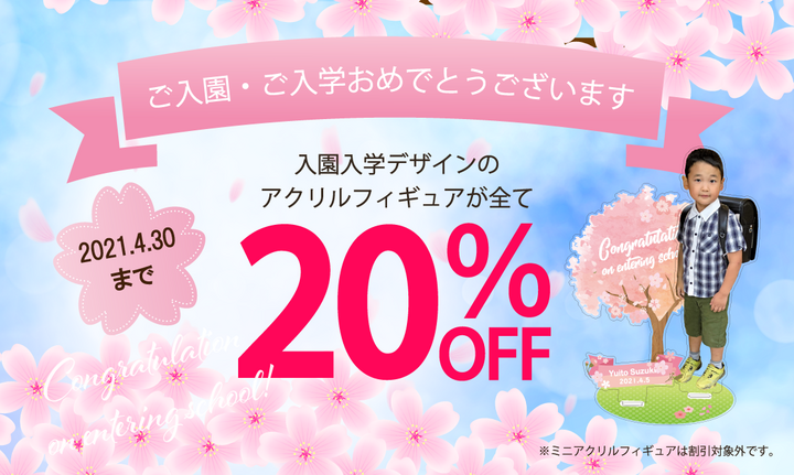 新しい制服・ピカピカのランドセルを背負ったお子様の姿をアクリルフィギュアにして記念に残しませんか?今だけの特別価格!商品代金から20%割引にて作製させていただきます。
