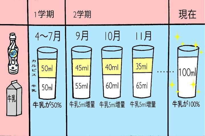 また、牛乳が飲めない事に関して「見た目」、「味覚」、「体質」などのさまざまな理由があり、その理由に合わせた対応が必要で、少しずつ飲めるようになるための工夫が時系列で紹介されています。