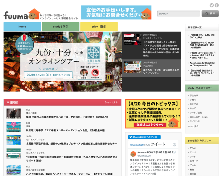 24時間365日更新中!常時2,000件以上のオンラインセミナーやオンラインイベントを簡単検索できるポータルサイト「fuuma(フウマ)」をリリース。 当サイトは「Study(学ぶ)」と「Play(遊ぶ)」の2つの大きなテーマにわかれており、それぞれ1,000件以上の情報を掲載。 「Study」ではオンラインセミナー・ウェビナーが「ビジネス」「文化/歴史」「教育」「語学」など、細かなテーマごとに検索が可能。 「Play」も「音楽」「舞台/演劇」「ゲーム」「旅行」など15個ものカテゴリーに分かれており、ユーザー目線で検索しやすい機能を搭載しています。 企業主催から個人主催のものまで網羅して掲載しているため、ほかでは見つからなかったオンラインイベントをfuumaでは見つけられます。