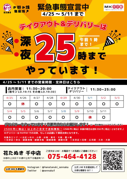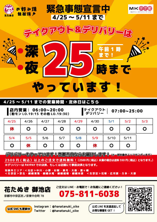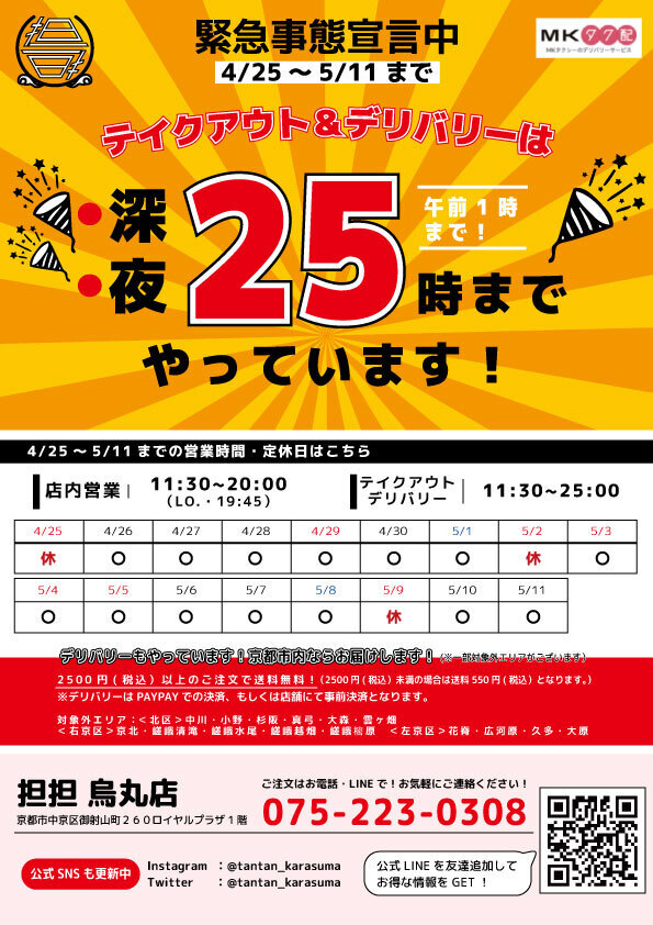 このようなお客様の状況をなんとか解決できないかといった想いで、この度期間中一部の店舗ではテイクアウト・デリバリーの営業時間を25時まで延長して営業する事といたしました。