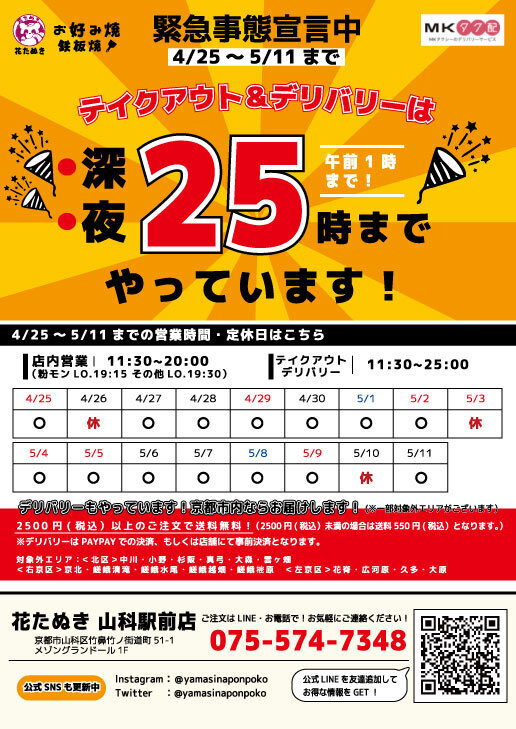 京都を中心に飲食店を運営するモンテステリースホールディングス株式会社(京都市右京区西京極南大入町29-4 代表取締役星山真也)は、緊急事態宣言の期間中、一部店舗のテイクアウト営業時間を深夜25時まで延長いたします。