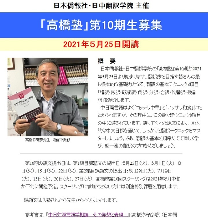 【日本僑報社発】ゴールデンウィークが終わった5月6日に、中文和訳専門の日中翻訳学院「高橋塾」第10期が第10期生を募集し始めました。