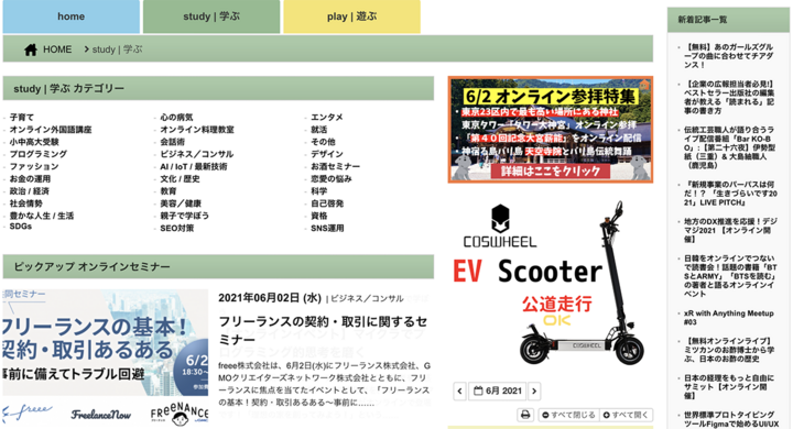 「Study(学ぶ)」には、オンラインセミナー・ウェビナーが1,000件以上掲載されており、