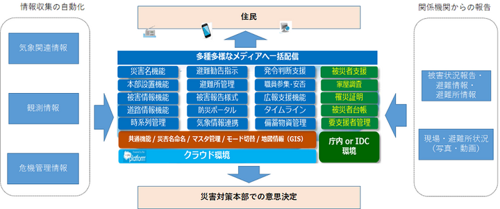 住民の生命や財産を守る活動に貢献できるように、気象・地震・津波・国民保護・観測情報、官民が保有する危機管理情報や現場被害の情報をリアルタイムに集約・見える化し「状況認識の統一」を行います。その上で、適切な災害対応業務(避難発令判断や応急対策活動等)の遂行、住民へ多様な媒体を介した避難情報の発信を行うことができるシステムです。