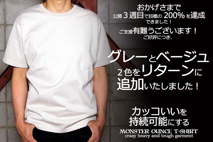 エップヤーン有限会社(本社:大阪府東大阪市、代表取締役:筒井利彦)は新商品「ペルー超長綿 モンスターオンス T シ ャツ」を購入型クラウドファンディング形式(CAMPFIRE にて実施)で 2021 年 5 月 14 日にリリースし、公開3週間目にして 支援総額が目標金額の 200%を超えました。6 月 7 日現在で目標の約 221%(¥1,109,850)に到達しています。ご好評にお応 えするために 6 月 1 日にはグレーとベージュの 2 色をリターンに追加いたしました。衣類の型崩れを防ぐゼロトルク®撚 糸の技術が T シャツの頑丈さを極限まで引き上げ、13.5 オンスの極厚生地がシルエットをスッキリと見せる。長期間にわ たるカッコ良さの持続可能性を約束する 1 枚です。