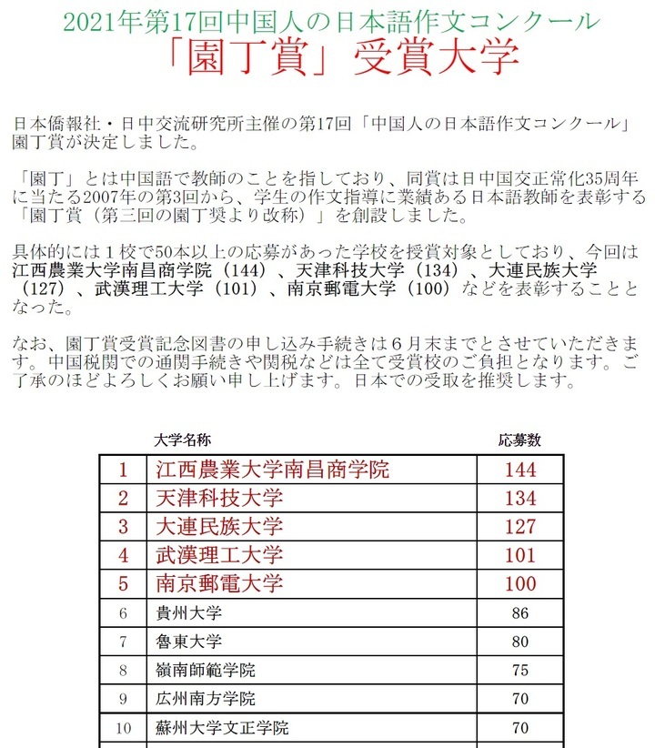 具体的には1校で50本以上の団体応募があった学校を授与の対象としており、今回は江西農業大学南昌商学院(144)、天津科技大学(134)、大連民族大学(127)、武漢理工大学(101)、南京郵電大学(100)などを表彰することとなった。名簿→ http://duan.jp/jp/2021c.htm