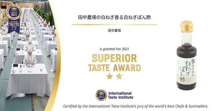 稲作を中心に農薬不使用または低農薬・有機質肥料で栽培している「有限会社 田中農場(鳥取県八頭郡八頭町、代表取締役 田中里志)」は、世界中の食品・飲料品の「味」を審査する国際的権威のある機関のInternational Taste Institute 2021年審査において、白ねぎ香る白ねぎぽん酢の味覚と品質などが評価され「Superior Taste Award 2 Stars ★★(優秀味覚賞・二つ星)」を受賞しました。